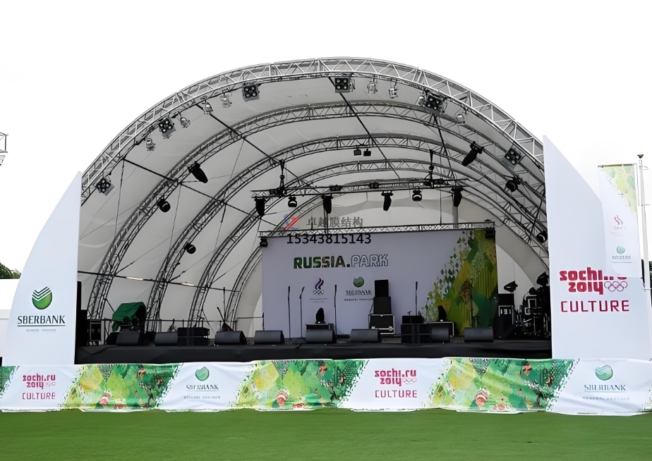 遮陽(yáng)與避雨:對(duì)于野外舞臺(tái)而言,遮陽(yáng)和避雨是非常重要的功能需求。膜結(jié)構(gòu)舞臺(tái)可以有用地阻撓陽(yáng)光直射和雨水侵襲,為藝人和觀眾供給一個(gè)舒適的環(huán)境。在酷熱的夏日,膜材可以阻撓部分紫外線,下降舞臺(tái)區(qū)域的溫度,避免藝人因高溫中暑,一起也讓觀眾在觀看扮演時(shí)愈加舒適。在雨天,膜結(jié)構(gòu)可以避免雨水落在舞臺(tái)上,確保扮演設(shè)備不受損壞,藝人的扮演不受影響。