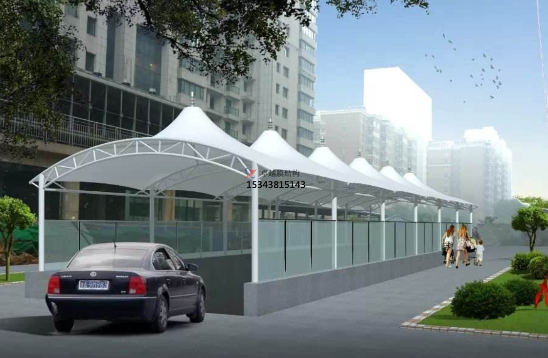 車庫出入口膜結(jié)構(gòu)頂棚是一種現(xiàn)代化的建筑結(jié)構(gòu),它采用高強(qiáng)度、耐久性的膜材料,通過鋼骨架、拉索、張力桿等構(gòu)件,形成一種穩(wěn)定的空間形態(tài),用于車庫出入口的遮陽和防護(hù)。這種結(jié)構(gòu)不僅具有良好的透光性和抗風(fēng)能力,而且設(shè)計簡潔美觀,非常有現(xiàn)代感。