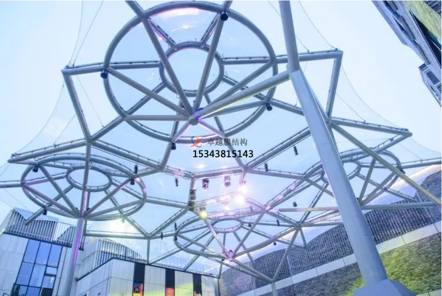 駐馬店市某ETFE膜結構工程是由專業的膜結構公司設計、制造和安裝的,該工程采用ETFE材料制作而成,具有美觀、耐用、環保等特點,可以用于遮陽、擋雨、裝飾等用途。