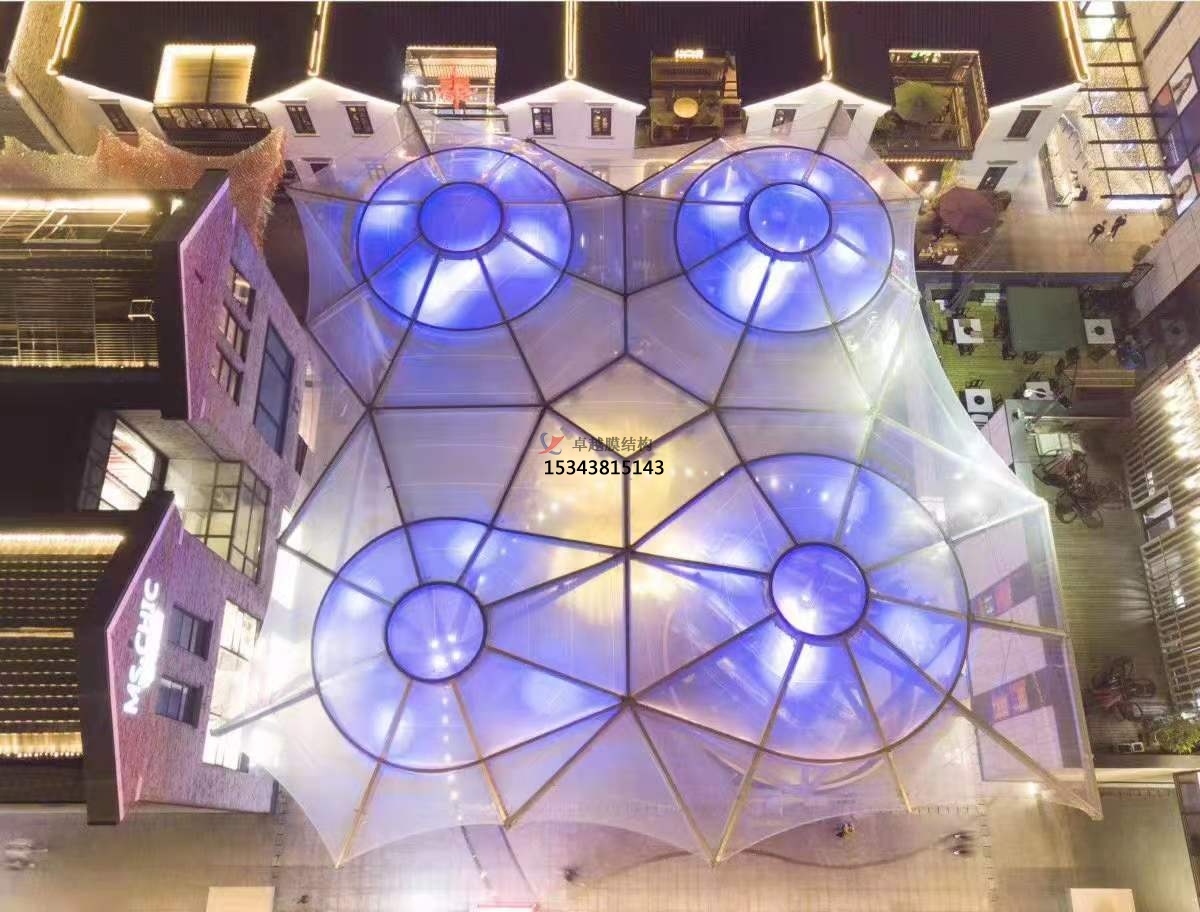 3、PVC、PVDF膜材料特點說明:PVC膜材料的織物基材應為聚酯類、聚酰胺類的纖維織物。涂層主要為聚氯乙烯類(PVC)樹脂,依據功能要求不同涂層的重量應在400~1500g/m2之間,面層宜選用聚偏氟乙烯樹脂(PVF)、聚二氟乙烯樹脂(PVDF)、聚丙烯樹脂(ACRYLIC)、硅樹脂等,且應具有改進PVC膜材料的自潔性及抗老化性能的功能。PVC膜材料的厚度應大于0.5mm。面層在保質期內應具有穩定的抗腐蝕、抗紫外線的侵蝕能力,具有自潔性能。