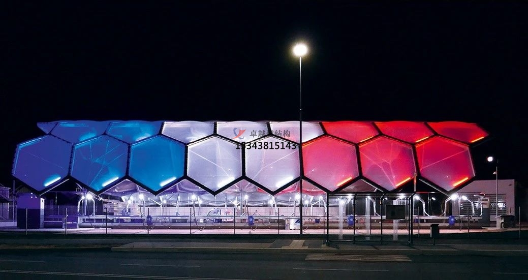 張拉膜結構可以根據需要制成任意復雜曲面形狀,體現自然流暢之美;并有多種顏色的膜材可選,以適應周邊的環境、滿足建筑效果要求;而且膜結構質量輕,一般不需要太龐大的支撐結構,這是其他建筑材料無法比擬的優勢所在。