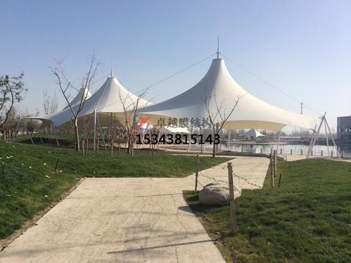 張拉膜景觀是一種建筑與結構完美結合的結構體系;它是用高強度柔性薄膜材料與支撐體系相結合形成具有一定剛度的穩定曲面,能承受一定外荷載的空間結構形式;這種結構形式特別適用于大型體育場館、人口廊道、小品、公眾休閑娛樂廣場、展覽會場、購物中心等領域。