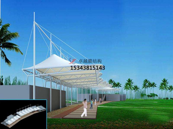 其二:膜材材質,PVC膜材與PVDF膜材作為兩種復合膜材,無論在防水、耐熱、抗腐中都具有一定的優勢,但PVDF膜材要優于PVC膜材。PVDF膜材是在PVC膜材上再作處理,一般PVC膜材的耐用年限是5-8年,改良后的PVDF膜材年限在10年以上,張拉性能、自潔性更好,表面灰塵會和雨水凝結成水珠,順勢流下,使膜材表面得到自然清洗。