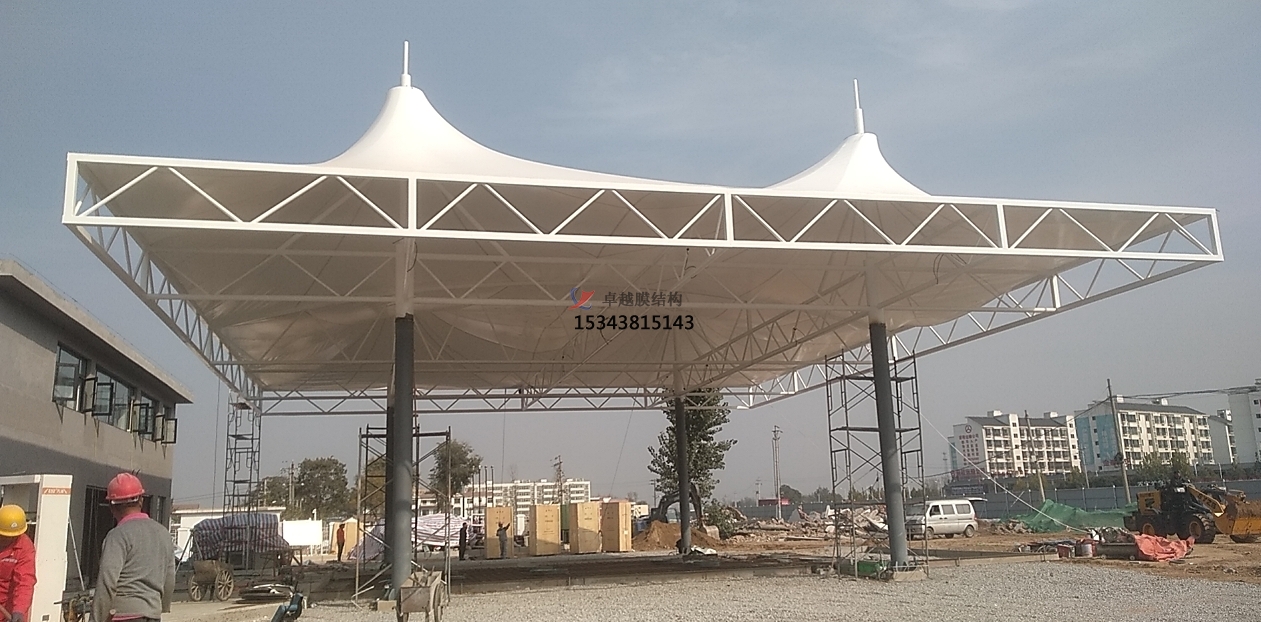 造型獨特:膜材料重量輕,適合加油站這種大跨度的建筑,而且是采用張力結構所以在造型設計上具有很大的優勢,可以實現非常具有藝術氣息的造型。