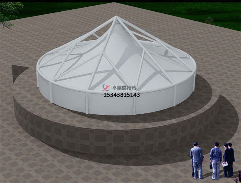 8、造型美觀:極具現代建筑感,造型飄逸美觀;自潔性能好,由于膜材表面具有PVDF自潔涂層,能有效減少膜材表面的積灰的附著力,通過自然雨水即可以得到有效清洗,其抗污能力遠遠大于其他傳統覆蓋材料,能使其長久保持亮麗的觀感;良好的光學性能。