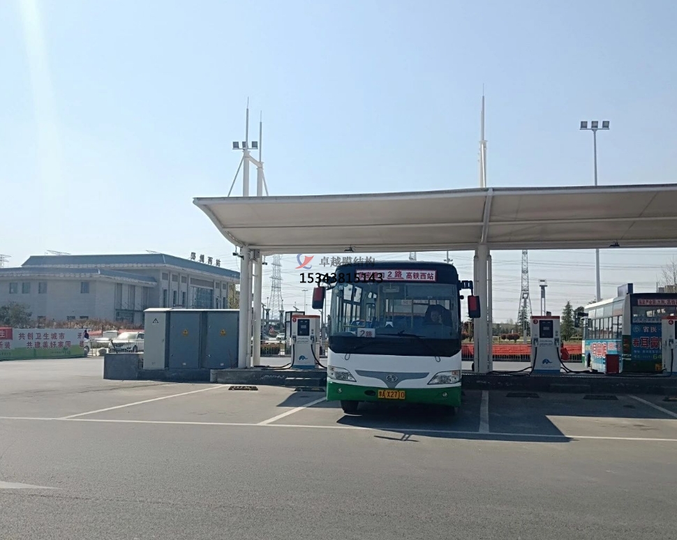 膜結構車棚在此發揮了重要作用。一般采用骨架式,先用鋼材制成骨架,然后安裝膜材,通過加強構建(鋼索、鋼柱)使其內部產生一定的張力行程車棚形狀,能夠承受一定的風載荷跟雪載荷。使用張拉式的也比較多。也有使用充氣式的,這種比較高端維護成本比較高使用比較少。
