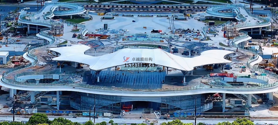 六、膜材安裝:膜結構的安裝包括膜體展開、連接固定和張拉成形三個部分。膜結構安裝時,應在膜面上安設爬用安全網,作業人員必須系安全帶。在安裝過程中,作業人員在膜面上行走應穿軟底鞋,不應佩掛鑰匙等硬物。