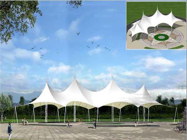 2、景觀膜結構是目前發展很快的一種新型空間結構,是一種效率極高的張力集成體系,可以充分發揮鋼索的強度與張拉整體結構的空間作用。它通過鋼骨架、鋼索與膜材共同受力形式穩定曲面來覆蓋建筑空間,具有高度的形體可塑性和結構靈活性,即通過對膜材內部施加一定的預張力,使其具備了抵抗外荷載能力,從而充當結構材料的一種結構體系。我公司先后在金華地區承接了金華永盛廣場景觀、金華中心廣場景觀、金華建筑藝術公園景觀小品的設計施工,簡介如下: