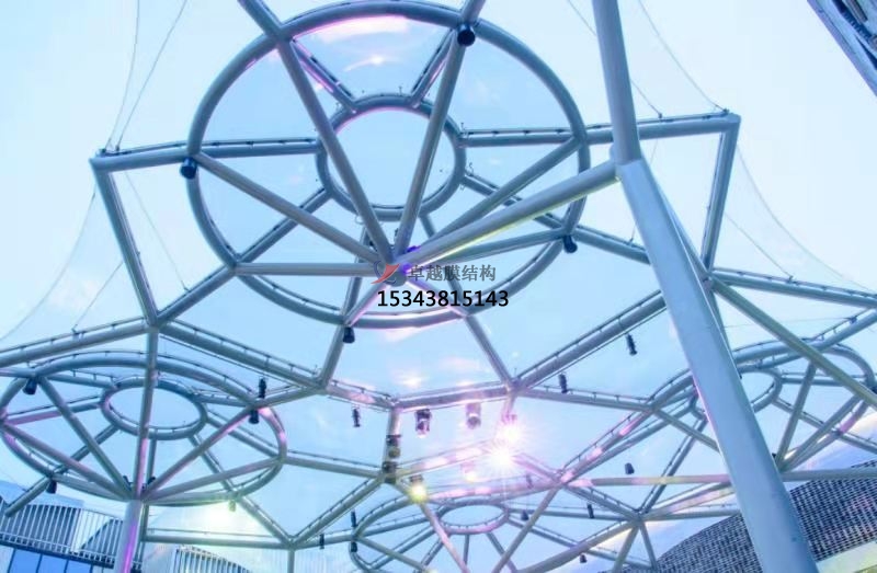 膜結構以高強度柔性薄膜(如ETFE、PVDF)為核心材料,結合鋼索、桁架等支撐體系,形成兼具輕量化與高穩定性的空間曲面12。其自重僅為傳統鋼構的1/3,大幅降低基礎造價,同時支持50米以上無柱大跨度設計,為商業廣場創造開闊通透的公共空間。ETFE氣枕膜通過多層鍍點設計,可智能調節透光率與紫外線過濾效率,例如嘉興長安里商業街的天幕結構,既能實現光線漫射營造柔和氛圍,又能有效阻隔70%以上的紫外線輻射。