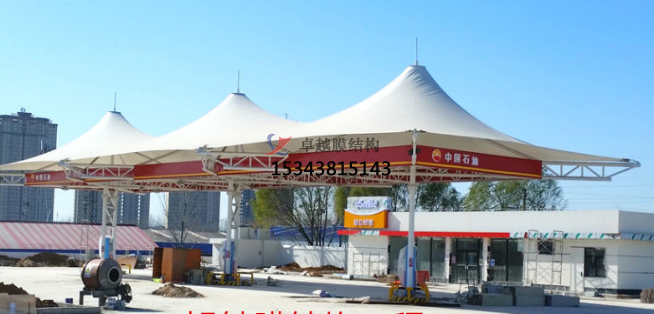 加油站膜結構,一般是指安裝在加油站的膜結構頂棚。膜結構頂棚因其自重輕,具有良好的受力特點,所以成為大跨度空間結構的主要形式之一,加油站膜結構也屬于其范疇。