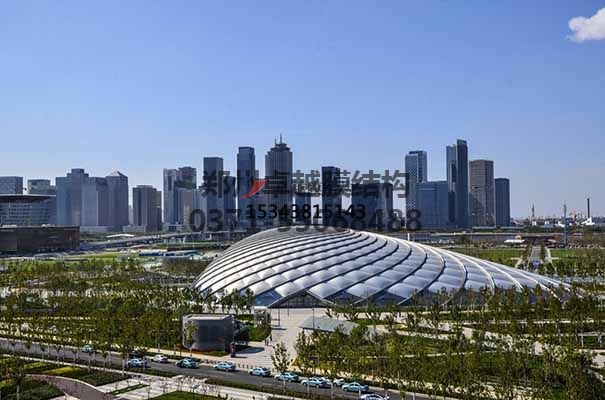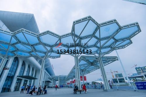 項目概況:項目設計成倒喇叭形狀,采高度21米,外挑9米,采用PTFE膜材,展開面積7400平米。