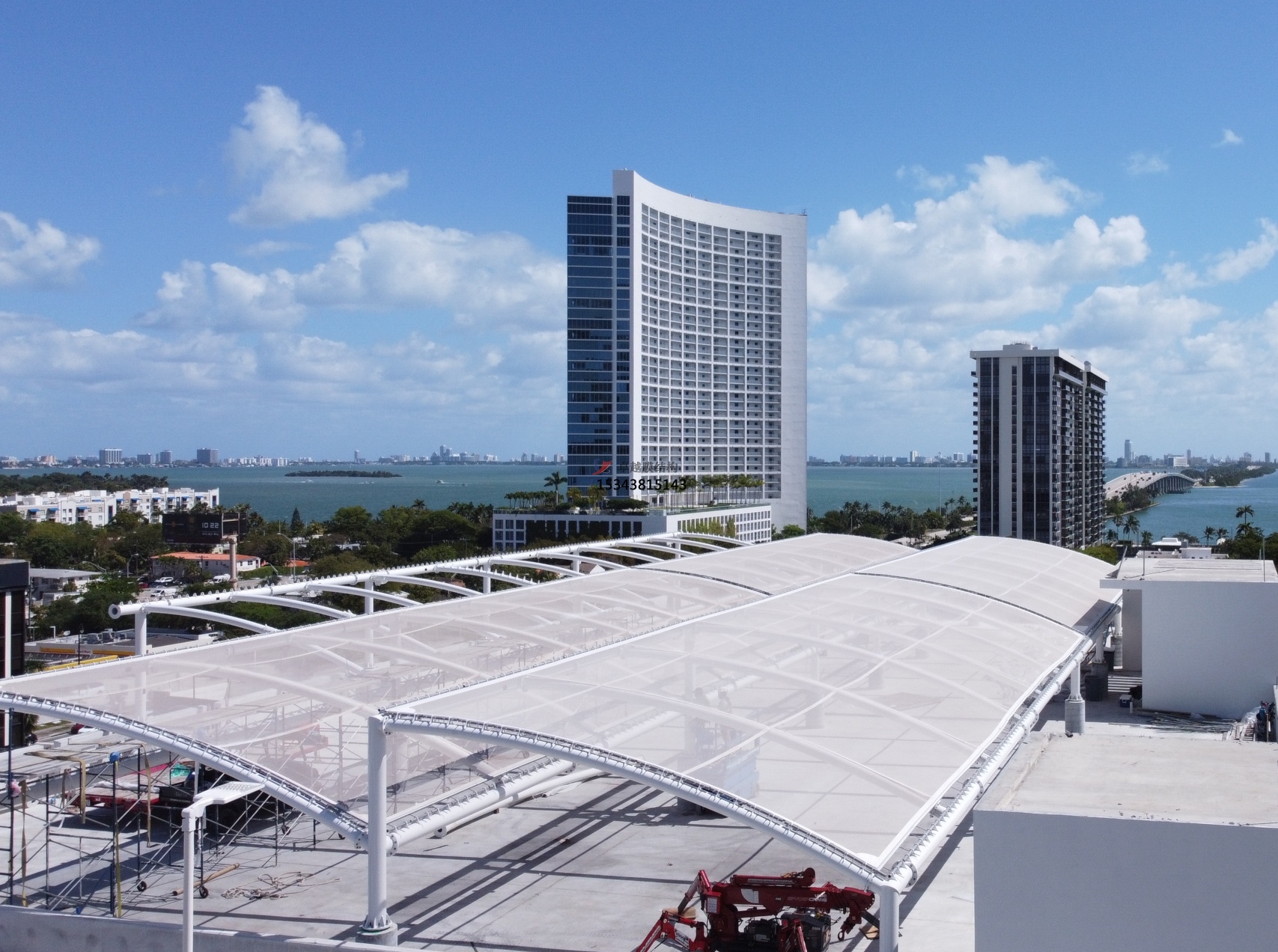 膜結構工程的加工制造膜材的首要加工流程包含: 進料-查驗膜材-膜片下料-編號-膜片編排放樣-膜片初粘-駁接-包裝。因為膜材的裁剪、包裝進程都較為復雜, 各種角度改變較多, 且加工精度請求非常高, 所以在制造進程中要加強質量管理, 保證制造精度。