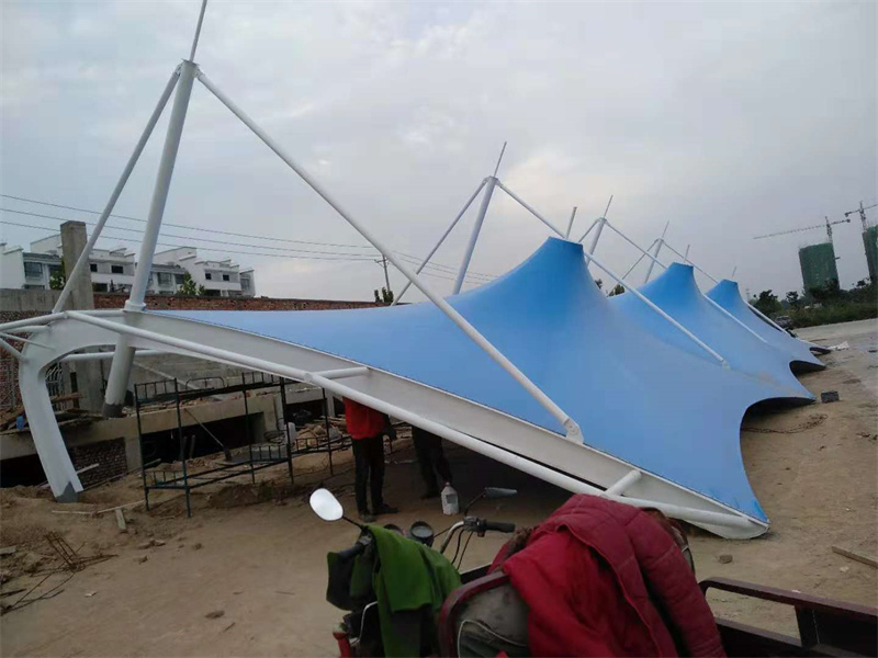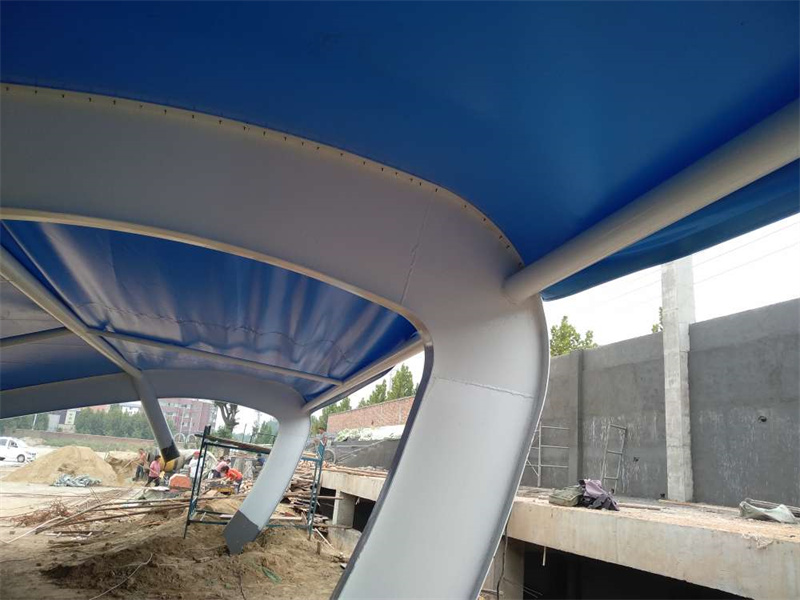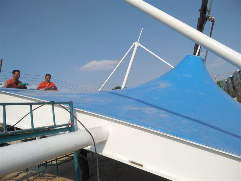 對邊角及有褶皺的區域進行局部張拉調節,并更終固定膜面及節點;完成雨水系統安裝及防水覆蓋等;