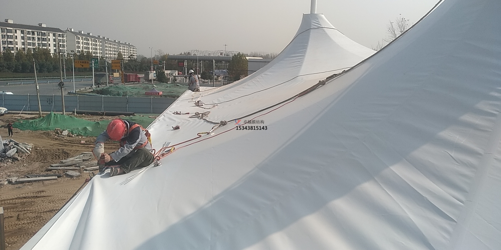 4、清理現場,在地面鋪墊保護材料;向工人講解工序及分工;展開膜面,進行如在膜面打孔、穿鋼索、安裝膜角節點板或膜夾板等準備工作;在支承結構上綁扎繩網以臨時支承展開的膜面。