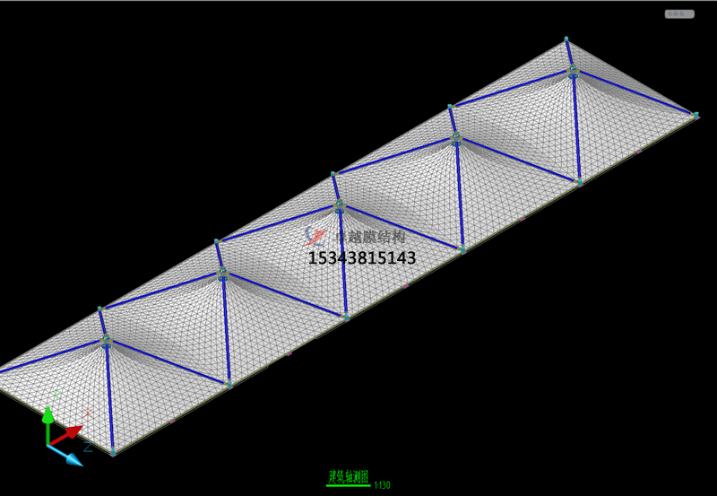 該圖片是污水池反吊膜結構長方形污水池封閉頂視圖,鋼構外面做支撐,帽口式連續反吊。