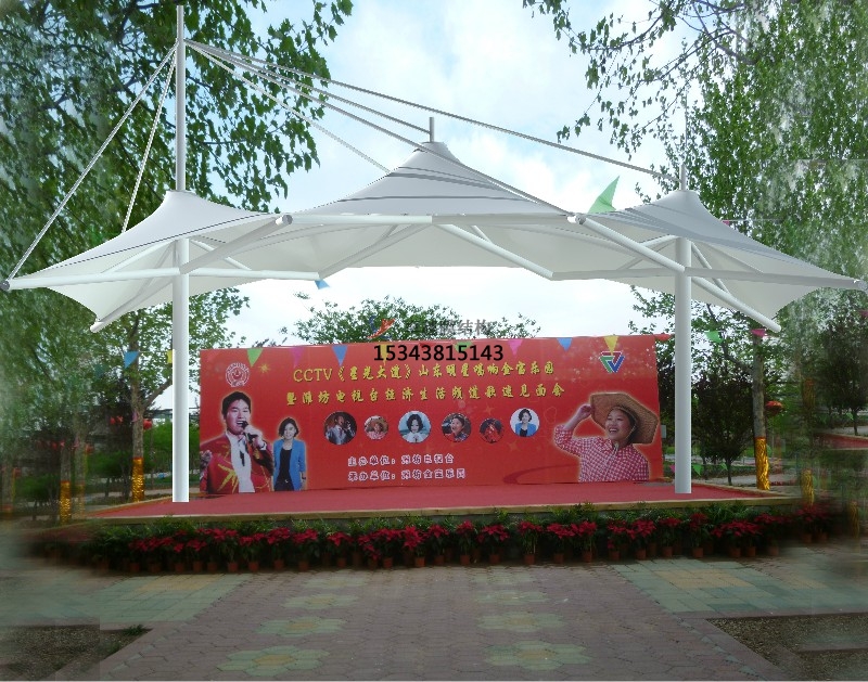 近年來,隨著建筑空間觀念的日益深化以及科學手段的不斷提高,膜結構已是現代建筑環境學發展的主流。它可以構成單曲面,多曲面等不同建筑結構形式,滿足了建筑師們對建筑與美學高度統一的要求。 由于膜材的光透性,白天陽光可以透過膜材形成漫射光,使舞臺下如同自然,能很好地節約能源。夜間彩燈打射形成的絢爛景觀也讓市民體驗到不一樣的感覺。膜材具有防水 性和遮陽效果,而不受到日曬雨淋,因此膜結構舞臺能創造出與自然環境相媲美的空間形式。