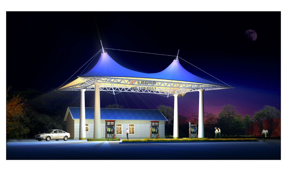 項目結構形式:骨架式膜結構加油站加氣站,四面自然排水,一側與站房搭接。