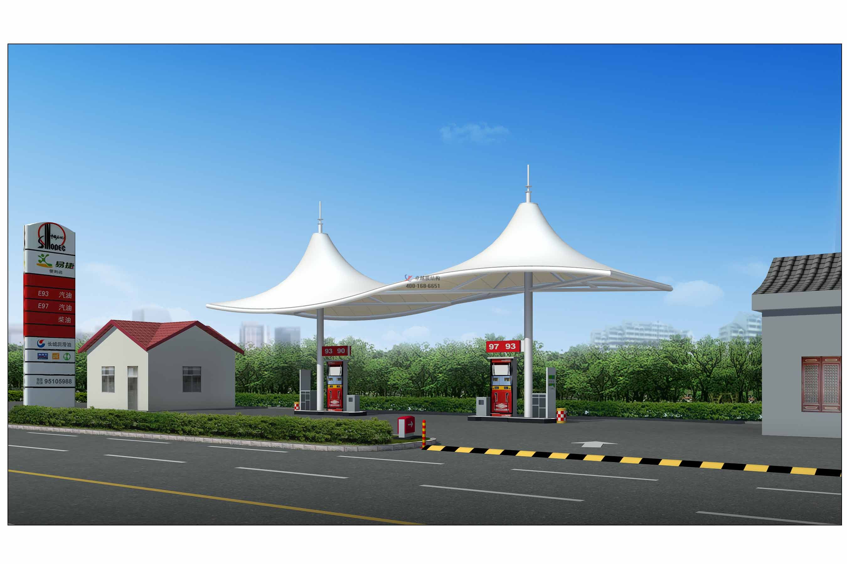項目結構形式:骨架式膜結構加油站加氣站,四面自然排水,一側與站房搭接。