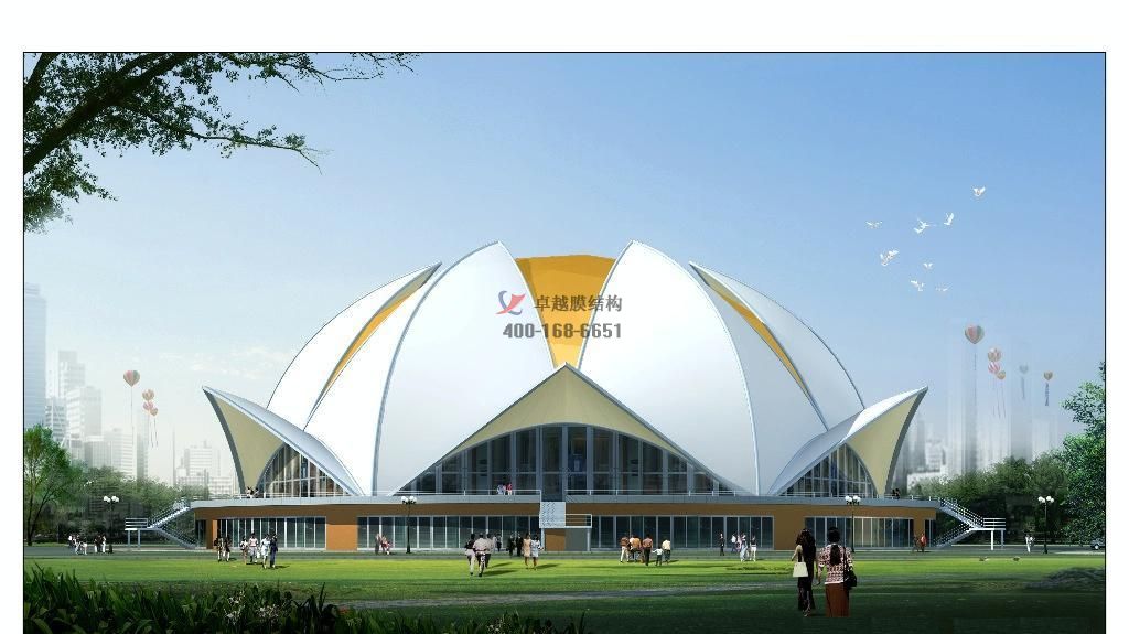 膜結構突破了傳統的建筑結構形式,具有造型優美、飄逸自然、融藝術、力學于一體,可充分發揮建筑師的想象力,建造成各種造型,且色彩豐富,膜結構被譽為21世紀的現代高科技綠色建筑。?