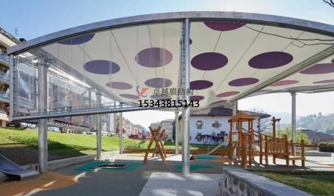 兒童游樂場所本就是趣致可愛的,迎合孩子們的喜好,配套遮陽設施的建設也應該考慮在內,下面兩個遮陽項目屬于同一系列,波點圖案,活潑的色調,再加上起伏的造型,讓人感覺輕松愉快。兩個項目都采用PVC+ETFE膜材。