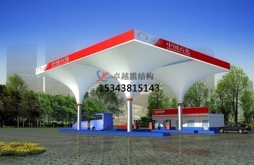 就拿加油站罩棚來說吧,傳統的罩棚一般是用無數根(只是想說數量大,別較真兒)鋼管組成的網架支撐起來的,沉重且易腐蝕,易褪色。膜結構加油站則大膽地走起了“減肥”路線,省去了這些網架,采用型鋼結構,不僅輕便了,還延長了使用壽命,而且檐面采用的膜結構復合材料,可保持10年不褪色。