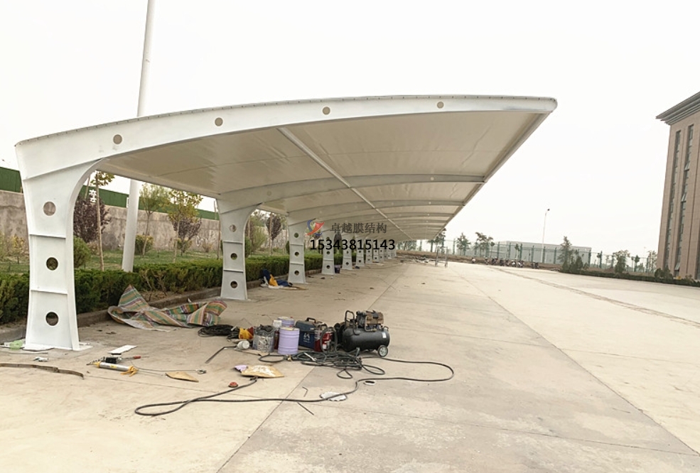 • 環保節能:膜結構材料通常可以回收利用,符合綠色建筑的理念。同時,雨棚的設計使得車棚內的照明需求較低,可以減少能耗。部分膜材料還具有高透光率和良好的熱反射性能,進一步提高了雨棚的節能效果。