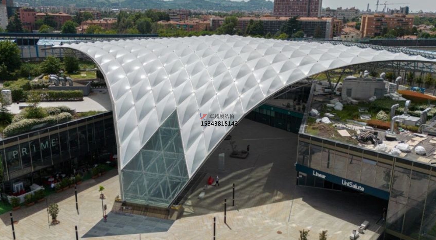 膜結(jié)構(gòu)雨棚在雨季為商場帶來了更好的顧客體驗,同時也有利于商場經(jīng)營和節(jié)能環(huán)保。