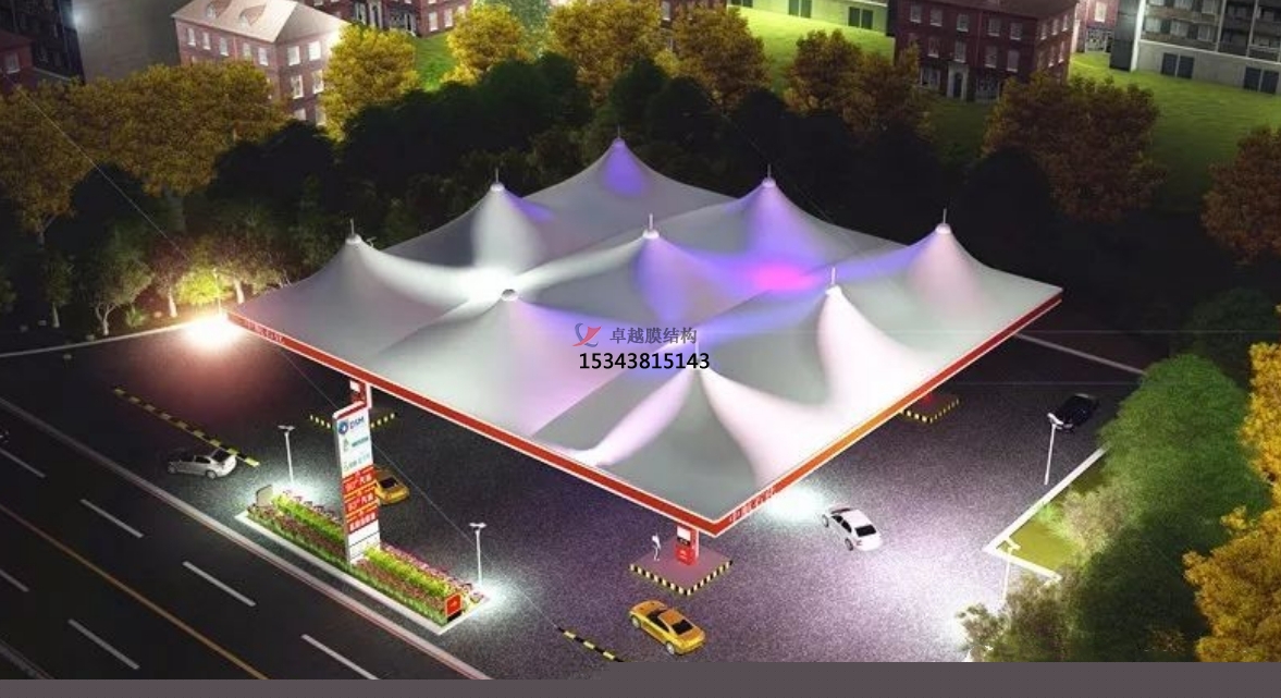 加油站的膜結構適合采用的形式有:多點對稱拋物面、組合拋物面、馬鞍形拋物面錐形雙曲拋物面、拱支承型等等。膜結構的鋼構件、膜面及其它零配件都是工廠預制件,安裝方便,施工時間很短。非常適合工期緊,需要短時間投入運營的加油站工程。