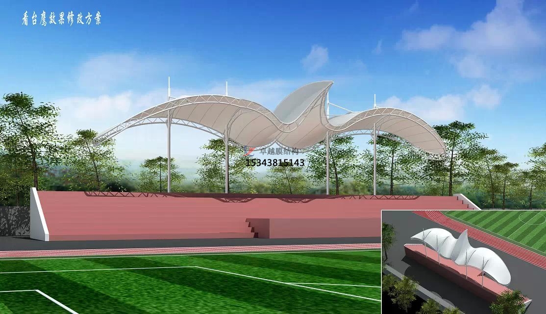 張拉膜看臺主要用于各類地方體育場主席臺雨棚,各類學校體育場看臺雨棚遮蓋,我公司是國內較早從事大懸挑張拉膜結構看臺設計施工的專業廠家,下面介紹一下我們在扶風縣周邊縣市完工的一些張拉膜看臺設計施工案例,我公司先后在扶風縣周邊承接了扶風縣初級中學膜結構看臺雨篷/主席臺/舞臺安裝雨棚、扶風縣天度鎮天度中心小學張拉膜張拉膜看臺罩棚、扶風小學張拉膜看臺遮陽棚等設計施工項目,簡介如下: