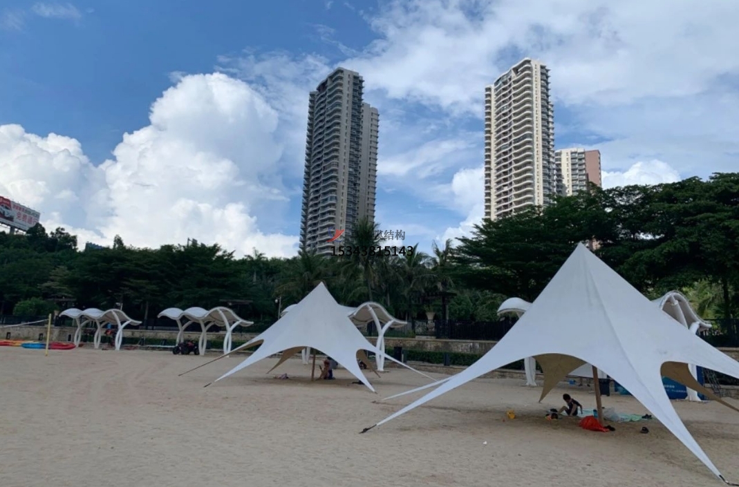 別看膜結構看似輕盈柔弱,實際上它卻擁有著出色的力學性能。它能夠承受一定程度的風雪荷載、風荷載等自然外力,并且具有良好的自潔性,經過特殊處理的膜材表面能夠在雨水的沖刷下自動清潔灰塵和污漬,保持外觀的整潔美觀。此外,膜材還具備較好的防火、防腐、耐老化等性能,確保了景觀棚在長期使用過程中的穩定性和安全性。