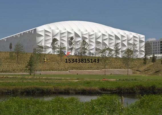 場館高30m,面積兩萬平方米,外敷可收回PVC膜,膜在后面的結構的效果下構成美麗的崎嶇。透光的外表皮能夠使得場館在白天能夠十分少的依賴人工照明。