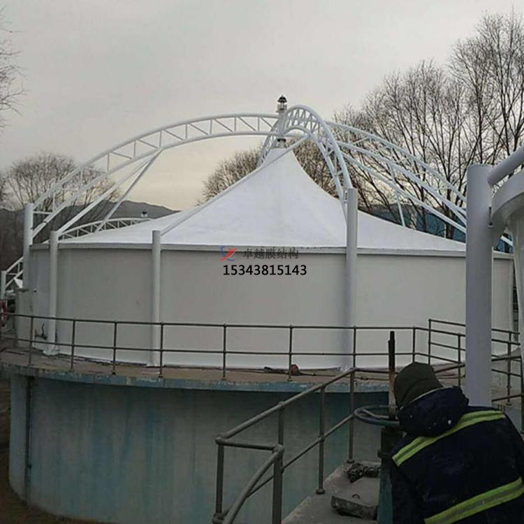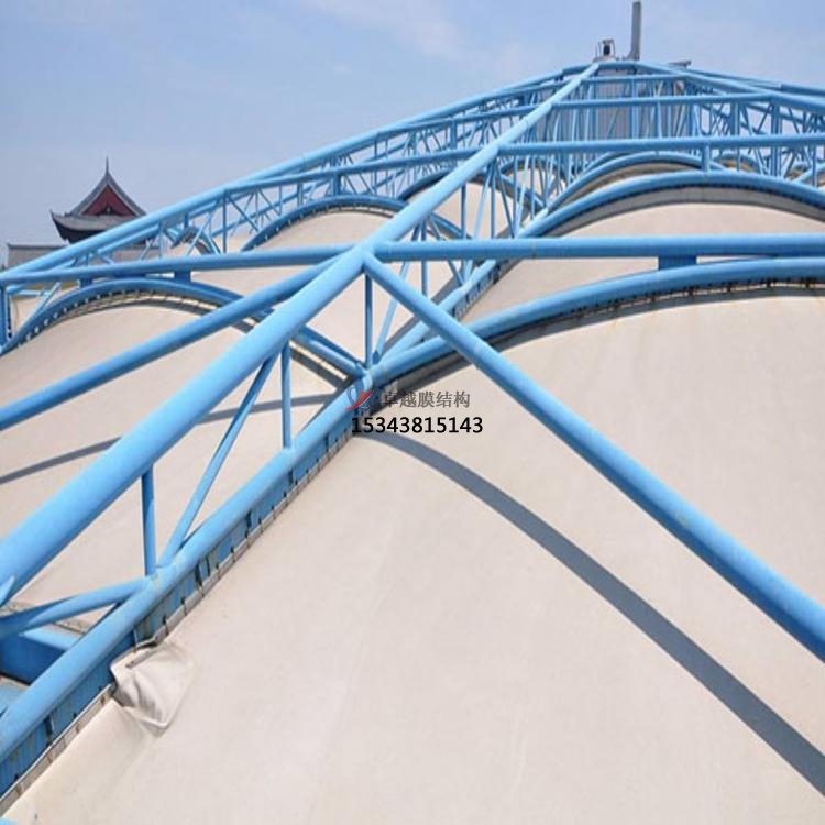 鋼架反吊膜結構是專門用于污水池加蓋密閉的一種膜結構形式,結構形式新穎,防腐耐霉,由鋼結構、膜結構及安裝輔件構成,根據不同污水池現場條件進行個性化設計安裝。鋼結構在外部形成穩定受力結構,膜材料反吊與機構內,隔絕廢氣對剛架構的腐蝕。鋼架反吊膜分為圓形反吊膜和方形反吊膜,其中方形反吊膜又分為拱形及吊帽結構。