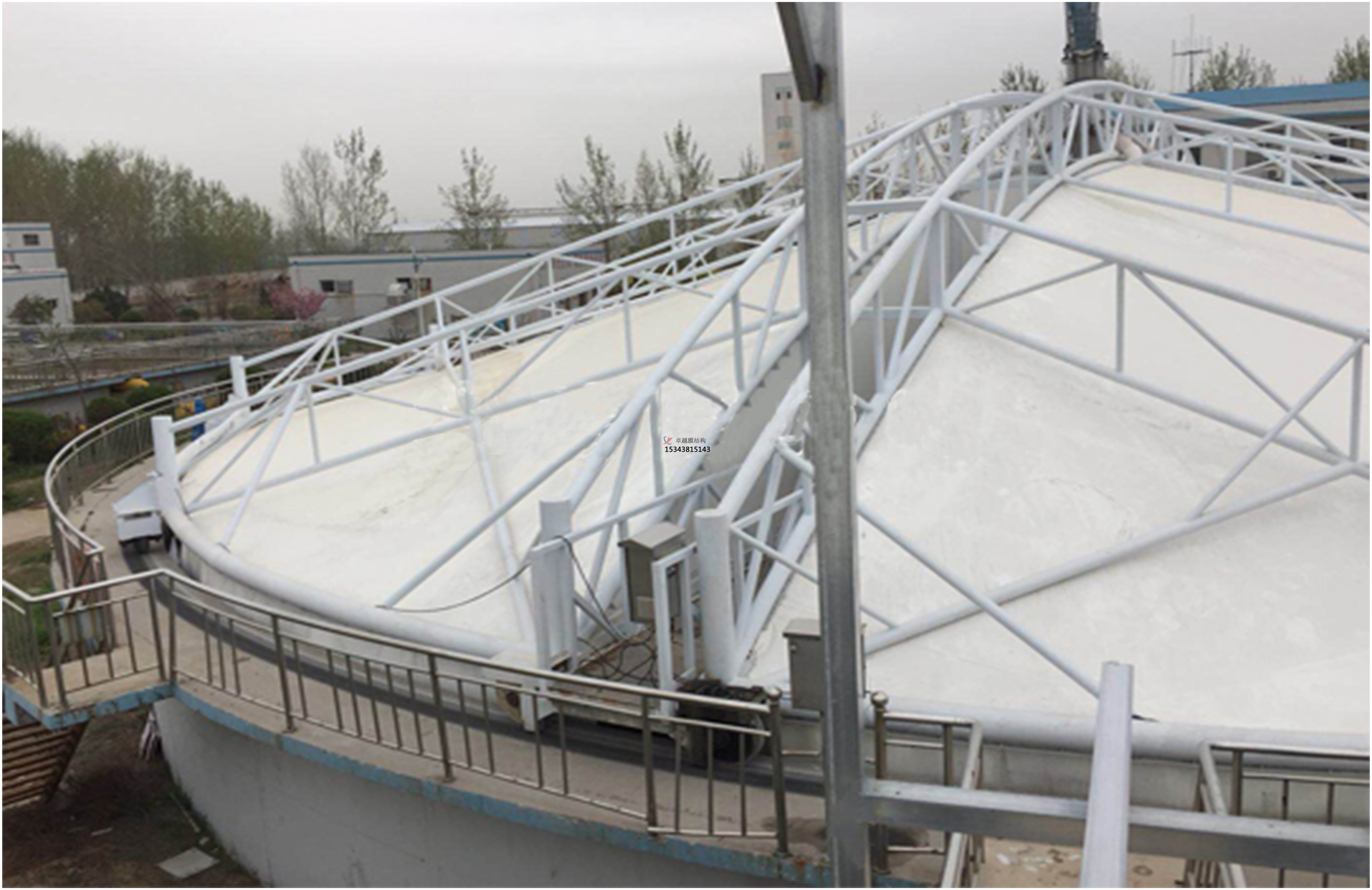 污水池封閉罩通常采用鋼支撐反吊UV膜結構技術,這種技術可以解決鋼結構由于與腐蝕性氣體接觸而帶來的腐蝕問題,同時實現了結構骨架與覆蓋材料的完美結合。此外,還有一種內外膜氣罩封閉技術,即雙膜氣罩,這種技術類似于在污水池上蓋了一個氣囊,通過四邊與污水池池壁的錨固,形成一個穩定的受力結構,從而將污水池池內惡臭氣體封閉在一個相對較小的空間里。