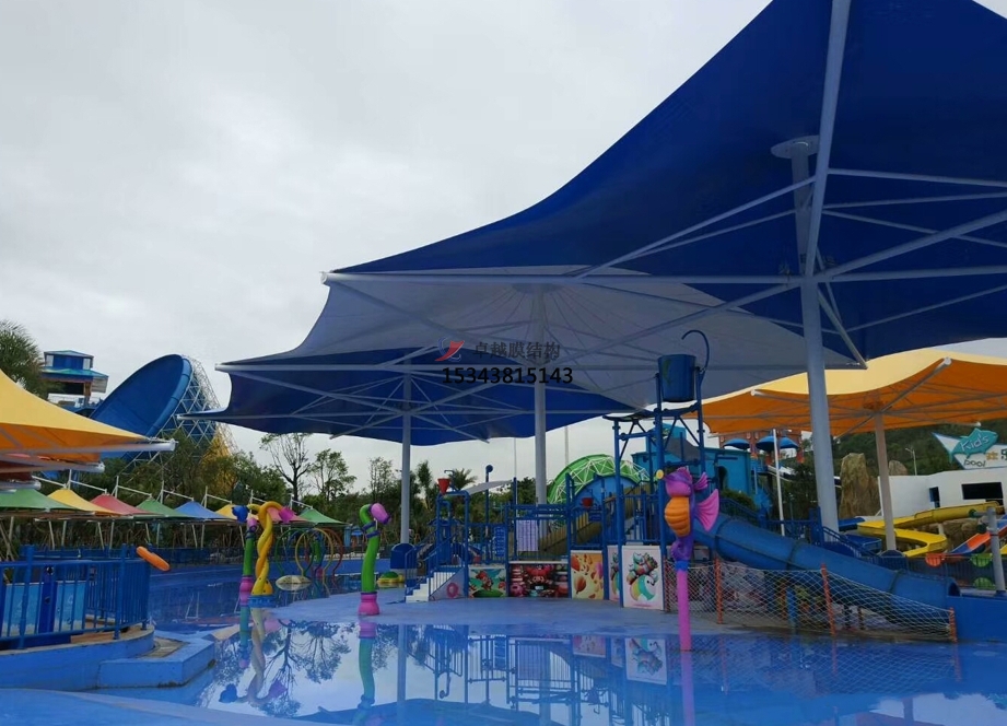 水上樂(lè)園遮陽(yáng)棚所使用的膜材自重更輕,而且膜結(jié)構(gòu)是依靠支柱,拉索,與膜面形成了預(yù)張力成型的,這就使得整個(gè)結(jié)構(gòu)非常的簡(jiǎn)單,特別是在游泳池這種大跨度的設(shè)施上使用,具有天然的優(yōu)勢(shì)。不僅能夠提供更大的遮陽(yáng)面積,而且由于質(zhì)地更輕安全性也更高。