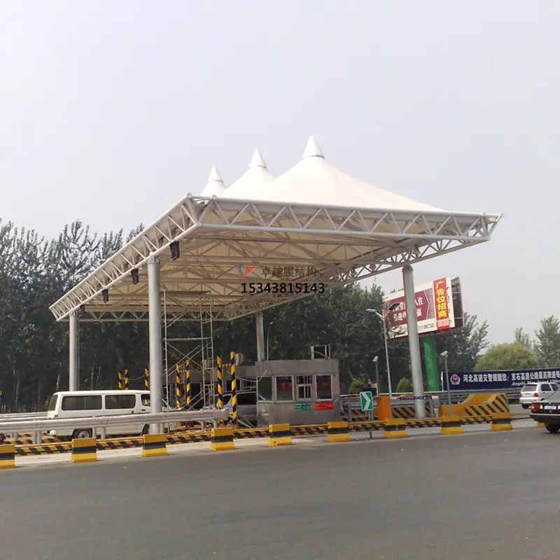 收費站張拉膜棚的結構穩定性是首先要考慮的因素。膜結構的設計需要依據收費站的建筑規模、地理位置和氣候條件進行定制化設計,以確保膜結構在使用過程中保持穩定。為了提高結構穩定性,需要在膜材和鋼索的選擇、張拉、連接等環節進行精細化處理。