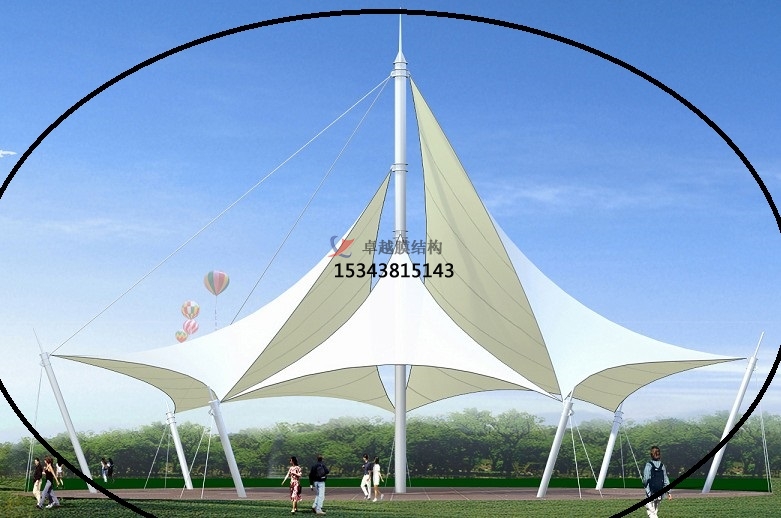 景觀園林膜結(jié)構(gòu)特點:其具有造型美觀獨特、透光性好、環(huán)保節(jié)能、自重輕、施工便捷、耐用性強、功能多樣等特點。膜結(jié)構(gòu)可以通過張拉形成各種獨特的曲面造型,如波浪形、傘狀、樹形等,能夠與自然環(huán)境完美融合,打造出極具藝術(shù)感和視覺沖擊力的景觀效果,為園林增添別樣的魅力。膜材具有優(yōu)良的透光性,透光率一般在 20%-95%之間,白天可以讓自然光均勻地漫射進(jìn)來,使園林空間更加明亮、舒適,同時節(jié)約大量照明能源,夜間在燈光的映射下又能營造出絢麗多彩的光影效果。膜結(jié)構(gòu)采用的膜材可回收利用,符合綠色建筑理念,而且其良好的保溫性能和反射光熱作用,能有效降低建筑的能耗,減少對空調(diào)等設(shè)備的依賴。膜材料自重僅為鋼結(jié)構(gòu)的 1/8,混凝土的 1/40,因此對地基基礎(chǔ)的要求較低,可建成大跨度的建筑,并且在地震等自然災(zāi)害發(fā)生時,具有良好的抗震性能。膜結(jié)構(gòu)的預(yù)制化程度高,現(xiàn)場安裝速度快,能夠大幅縮短工期,減少施工對場地和周邊環(huán)境的影響。常用的膜材如 PTFE、ETFE 等具有良好的耐候性、抗紫外線能力和防火性能,能夠適應(yīng)各種惡劣天氣條件,使用壽命長達(dá) 15-30 年。不僅可以作為遮陽避雨的設(shè)施,還能作為景觀雕塑、燈光載體、休息亭、觀景平臺等,提升園林空間的使用價值和功能性。