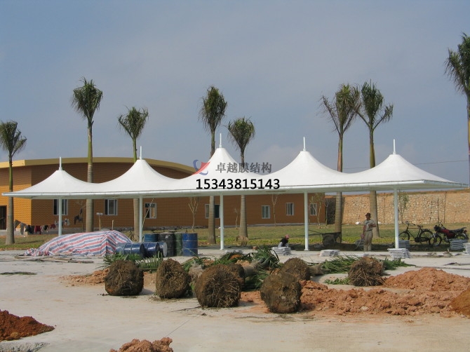某看臺工程采用張拉膜景觀,形式新穎、活潑。鋼架與索和膜合理結(jié)合,膜頂平滑過渡,結(jié)構(gòu)美觀、輕巧、整體造型相互輝映,自具一格。以下介紹的是該張拉膜景觀工程的設(shè)計步驟及準則,為以后工程的設(shè)計提供了參考。