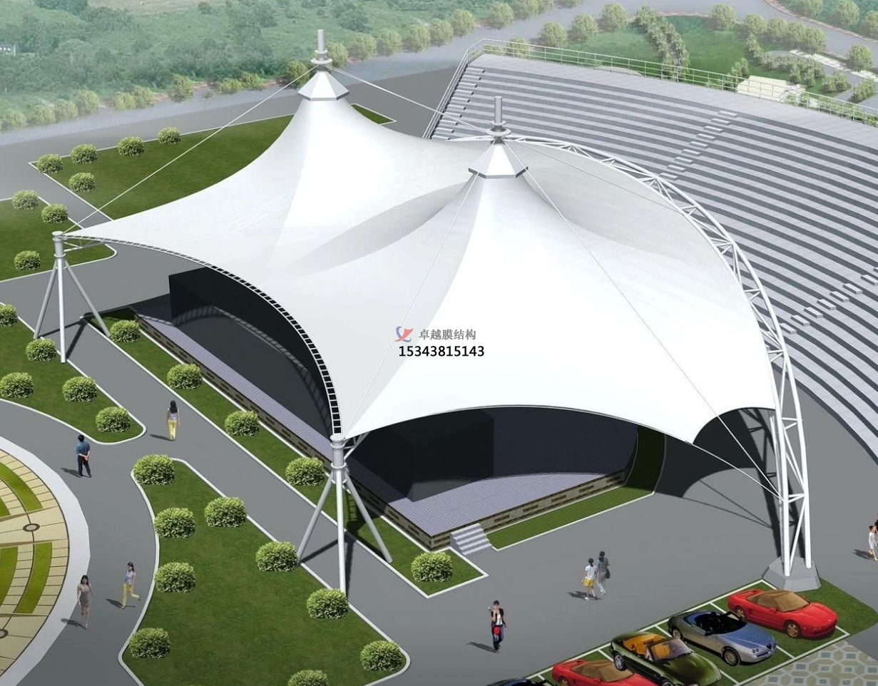 舞臺膜結構遮陽棚以其獨特的藝術魅力和實用的功能特性,逐漸成為眾多演出場所的首選。它不僅為舞臺表演提供了理想的遮陽和防雨解決方案,還通過其創新的設計和多樣化的造型,為觀眾帶來了全新的視覺體驗。