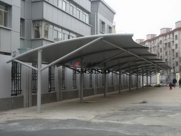膜結(jié)構(gòu)雨棚是一種全新的建筑結(jié)構(gòu)形式,它集建筑學(xué)、結(jié)構(gòu)力學(xué)、精細(xì)化工與材料科學(xué)、計(jì)算機(jī)技術(shù)等為一體,具有很高技術(shù)含量。其曲面可以隨著建筑師的設(shè)計(jì)需要任意變化,結(jié)合整體環(huán)境,建造出標(biāo)志性的形象工程。