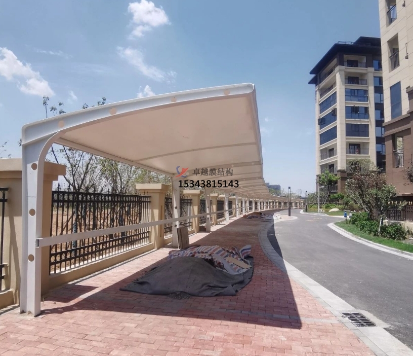 膜結構車棚在與以往的舊式車棚的比較中,整體能承受的載荷大很多,膜結構受力點小,單位尺寸上能承受的壓強高,膜結構車棚都穩固如山,并且膜結構車棚的透光性達到13%,不會因為長時間的直曬變黃,也不會物理特性發生變化,比如變脆,軟化等現象。