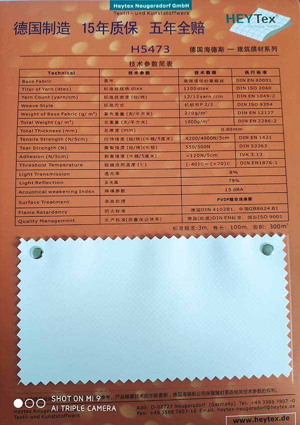 II. HeytexH5573建筑膜材為新一代可焊式PVDF復合材料,雙面PVDF涂層,直接焊接,10年質保。