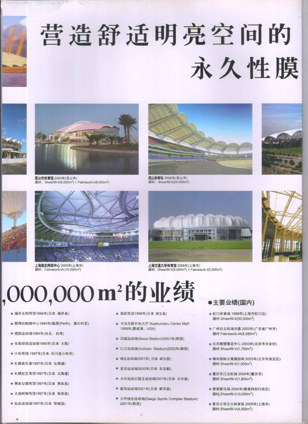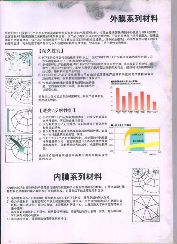 SHEERFILL產(chǎn)品能夠在-70C到+230C的溫度范團內(nèi)安全使用。具有良好的耐熱性、耐濕性、耐藥品性等特性,即使在承受了暴風(fēng)雪這類惡劣天氣后,膜結(jié)構(gòu)仍然能維持初始狀態(tài),膜材料不會產(chǎn)生松弛。