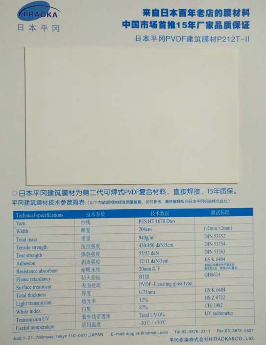 來自日本百年老店的膜材料,世界更早更著名的膜材生產廠家世界更早誕生膜結構的地方,世界好的能生產抗紅外線環保節能隔熱膜材的廣家。 全球僅有的兩家級防火膜材生產廠家之一2世界更大膜結構企業大陽工業專用膜材.2010世 博會世博四及部分場館合作...它在中國的出現,必將改變中國的膜結構市場,讓中國的膜結構工程質量達到世界一流水平!
